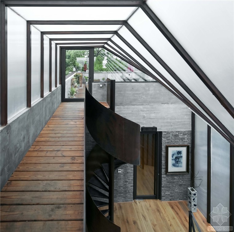瓷语堂项目是对建筑原真性的一次回归,我们希望通过一个最简单的手段介入场地,使得建筑物仅仅作为一个“存在”与基地发生关系,而不是通过美学加以评判。在面对场地现状已经存在的几栋老建筑和一棵大树,我们希望它们可以成为场地记忆的再现,作为新建筑的一部分共同留存下去,而不是简单的粗暴拆除并由一个全新的物体所替代。通过合理的结构布置和构造处理,新房子轻巧的微微落于老墙之上,二者完整的融合在了一起,斑驳的老墙和由砖、木等朴素材料构筑的新建筑自然而然的和谐共生,而老墙的岁月留下的痕迹亦为建筑提供了不可复制的特征。场地上的大树成为了我们南侧的重要遮蔽,使得二层的露台不会直接暴露在正对的一条小路前面,同时也为露台贡献了不同季节的多样风景和光影特质。作为陶瓷艺术家展示、交流和工作的场所,空间的布置简洁而不失特点,混凝土、青砖等朴素而带有一点点粗糙质感的材料与陶瓷艺术品相映成趣,建筑低调地成为了作品的背景。